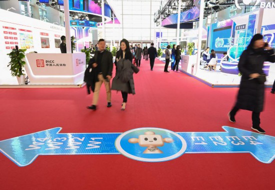 11月29日,通往链博会会场通道处的立柱上带有醒目底色的“链氪”形象标识引导参观人群。