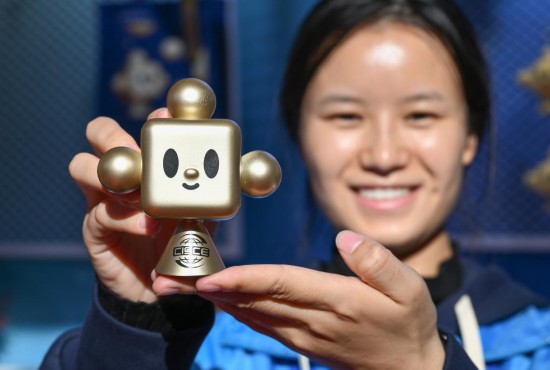 11月29日,在链博会文创小店服务的志愿者向记者展示 “链氪”玩具手办。