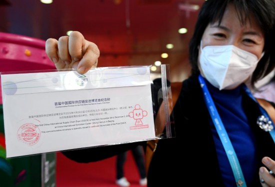 11月29日,一名观展者在自己购买的链博会纪念邮封上加盖了带有“链氪”形象的纪念邮戳。