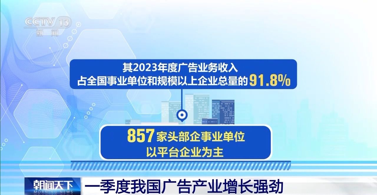 据了解,857家头部企事业单位以平台企业为主,数据显示其2023年度广告业务收入占全国事业单位和规模以上企业总量的91.8%。其中,头部平台企业广告业务收入占其营业收入50%以上。平台企业的广告业务不仅带动广大中小微广告企业构建起产业链,也为其开展人工智能、新能源、云计算等技术创新提供了资金保障。(央视新闻客户端)